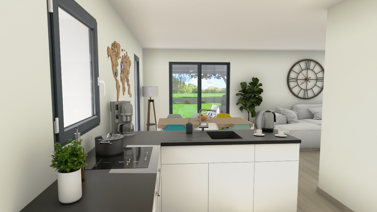 Conforme à la norme RE2020, cette maison bénéficiera d’un plancher chauffant et d’un système domotique complet pour piloter facilement le chauffage, les volets. Les matériaux et finitions seront choisis avec soin pour allier esthétique et performance.